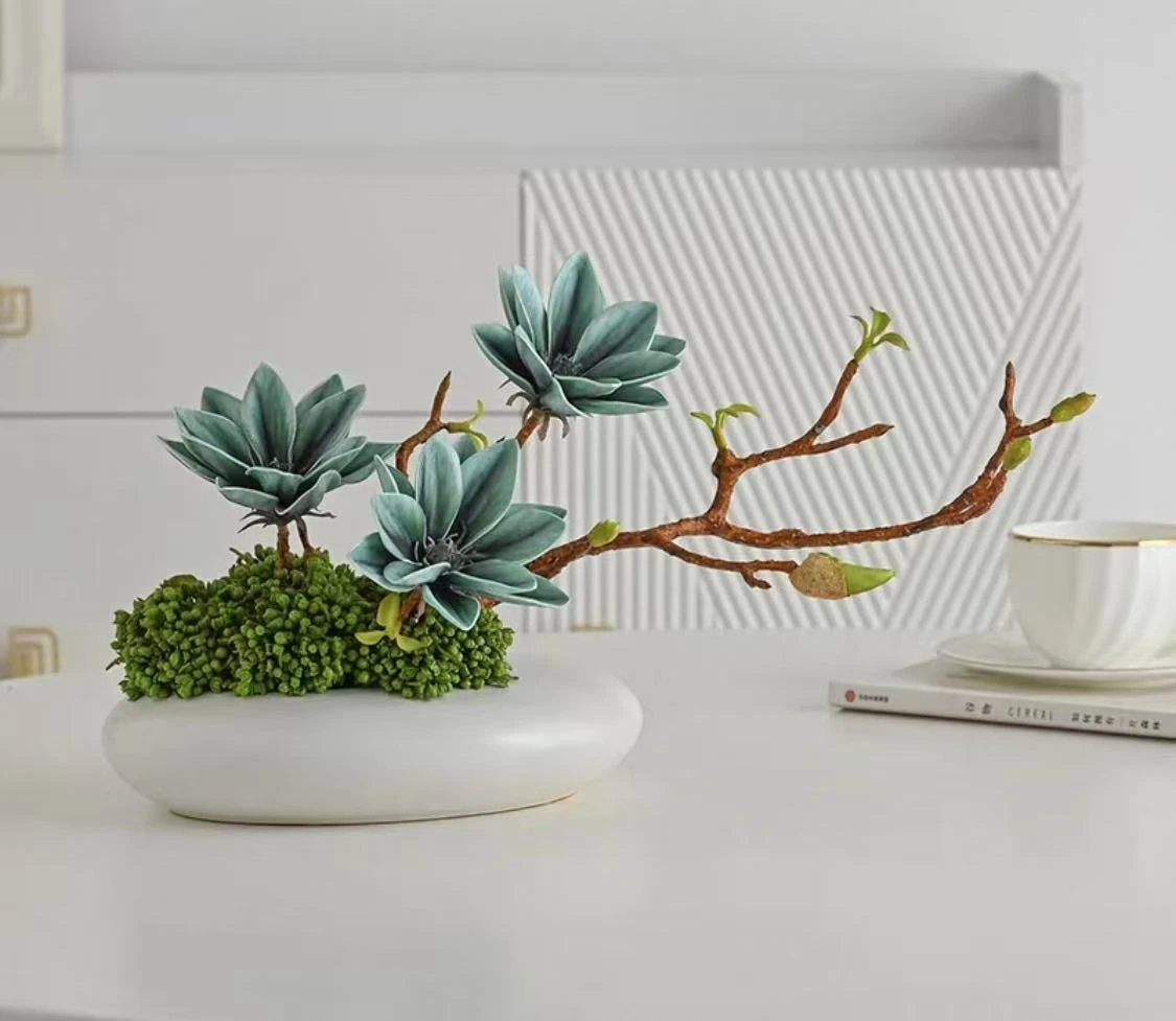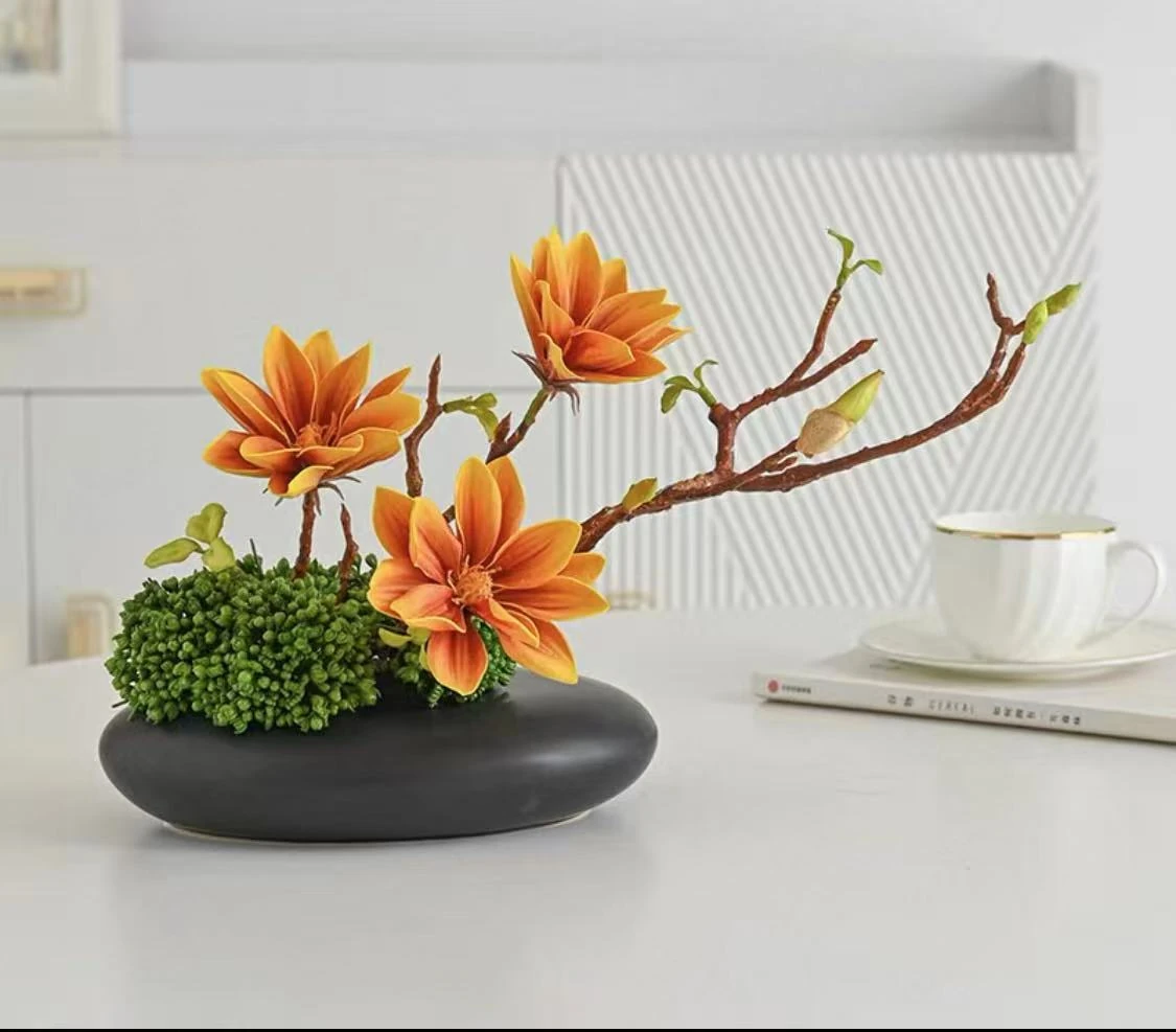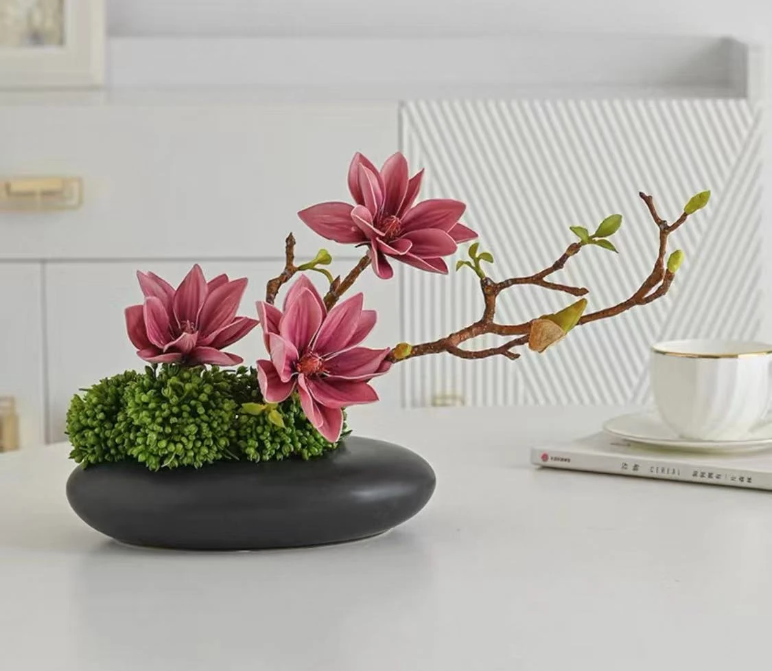 Plat noir – Magnolias de couleurs variées – Style intense – Hauteur 25 cm – Largeur 25 cm