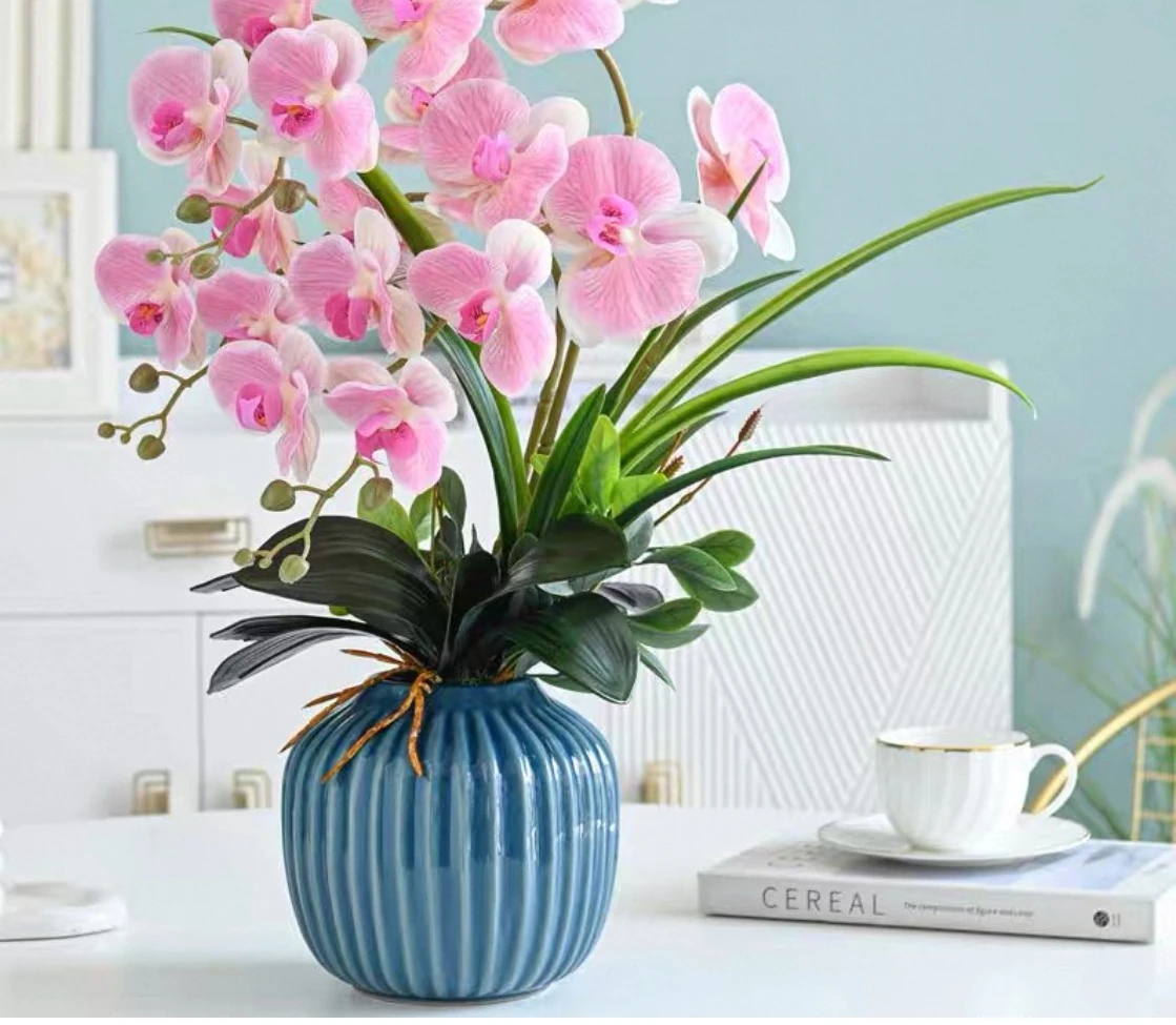 Arrangements d’orchidées de couleurs variées – Pot bleu en céramique