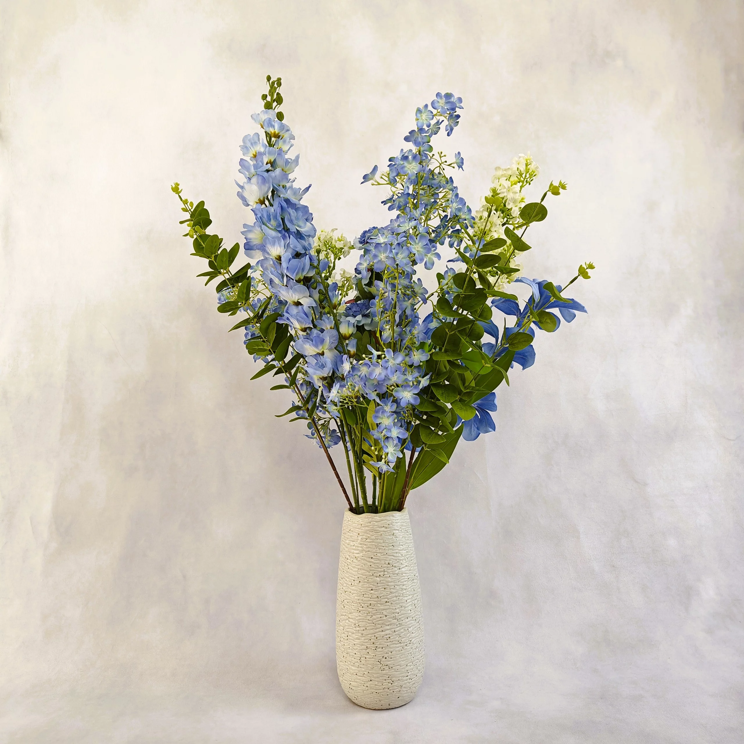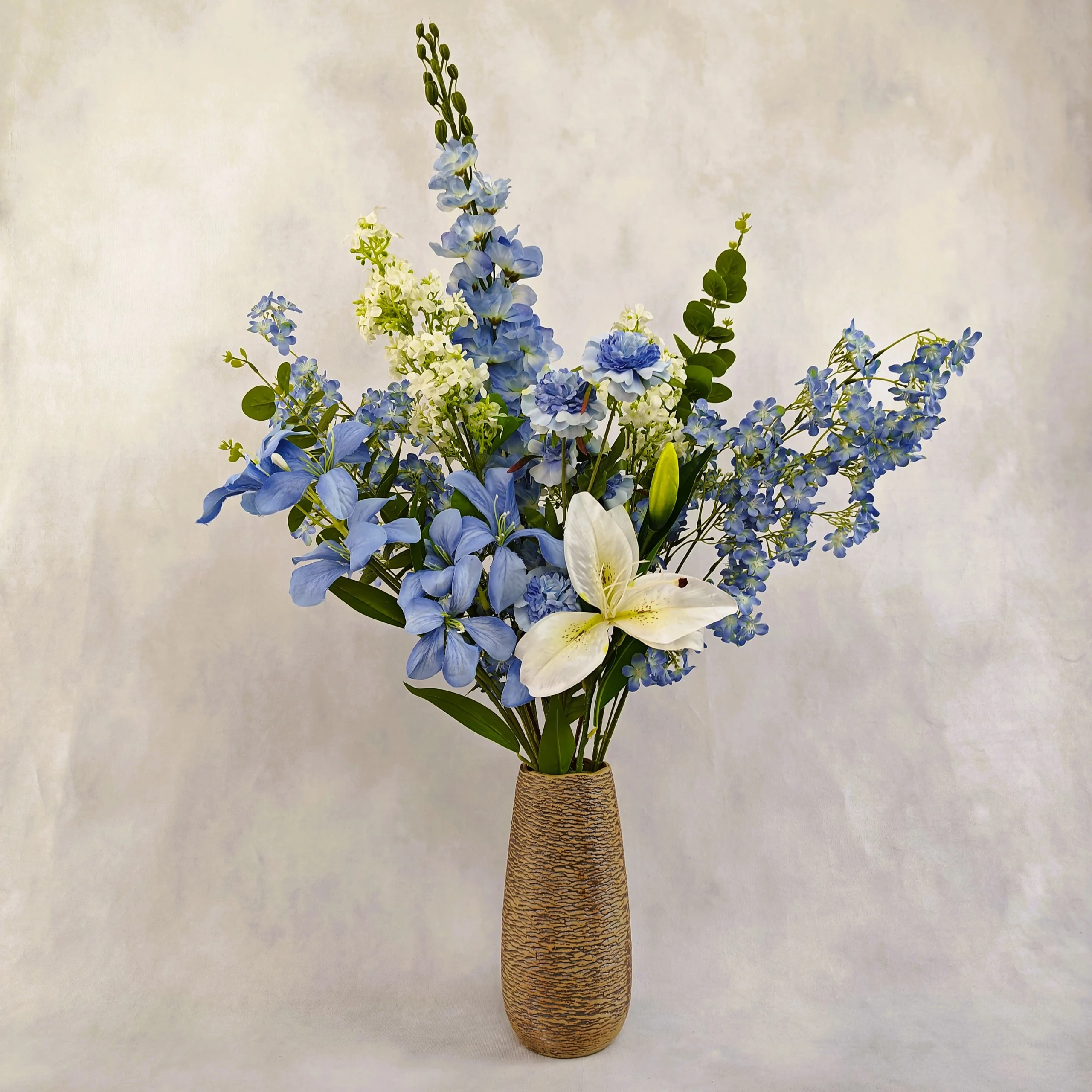 10 tiges – 1 delphinium,2 daphnés, 1 scabieuse, 2 murraya paniculata, 1 lys, 1 orchidée, 2 feuilles d’eucalyptus – Couleurs pastel – Mouvement naturel – Vase inclu, coloris au choix – Hauteur 80 cm – Diamètre 50 cm