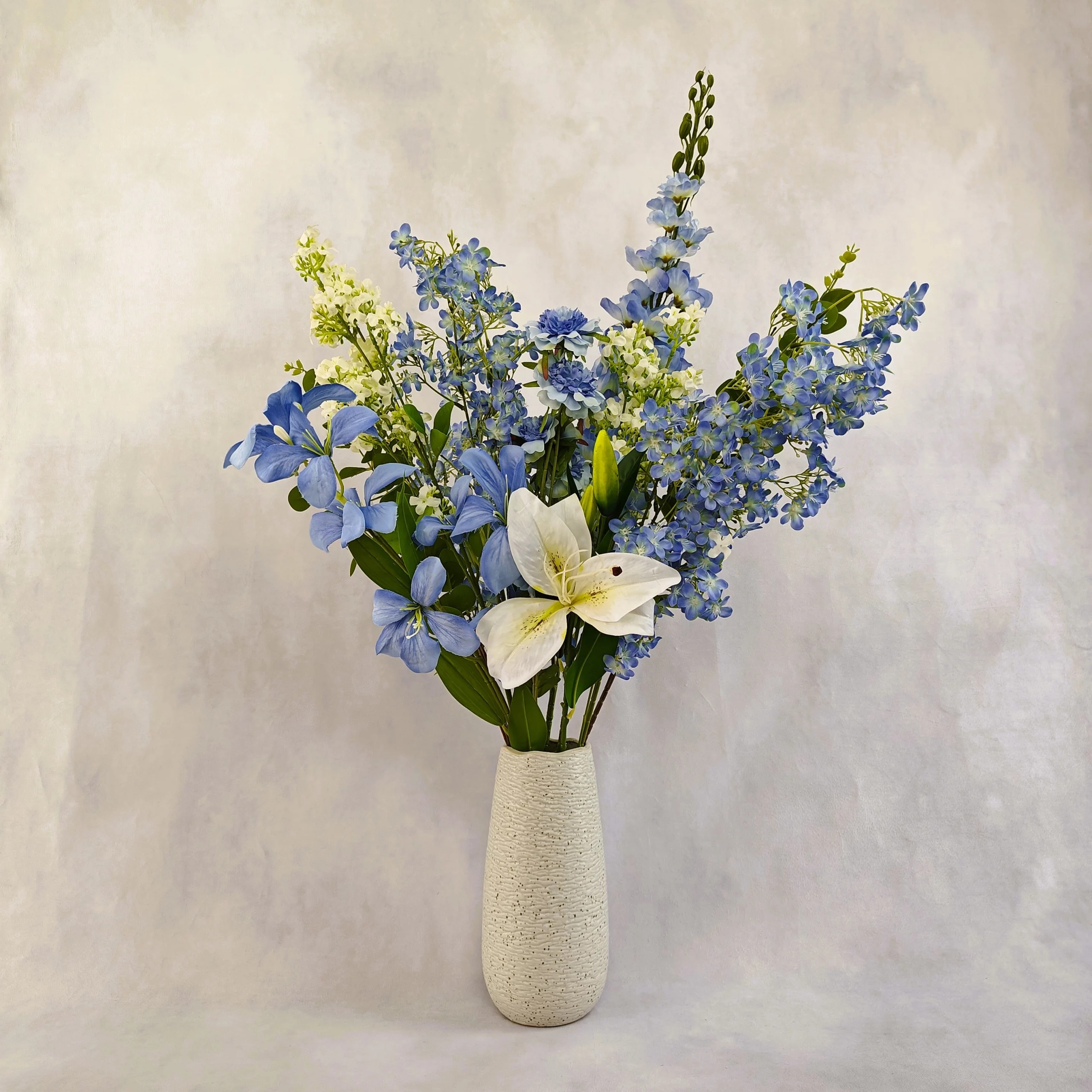10 tiges – 1 delphinium,2 daphnés, 1 scabieuse, 2 murraya paniculata, 1 lys, 1 orchidée, 2 feuilles d’eucalyptus – Couleurs pastel – Mouvement naturel – Vase inclu, coloris au choix – Hauteur 80 cm – Diamètre 50 cm