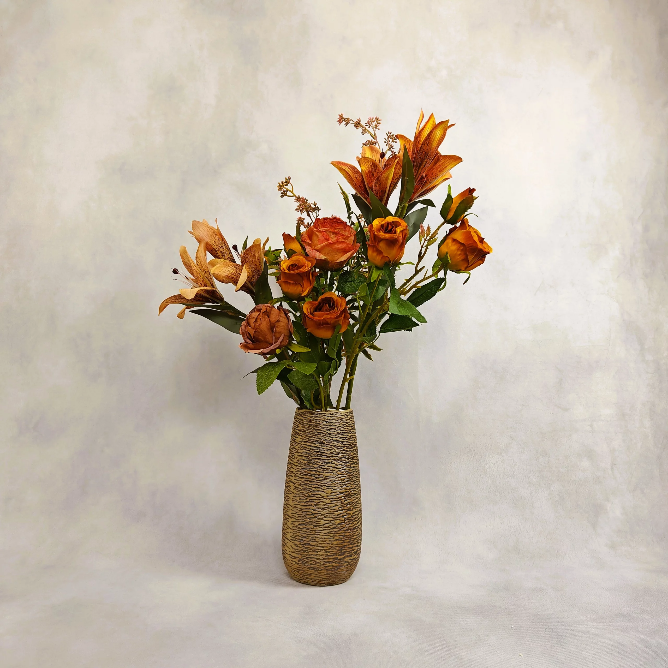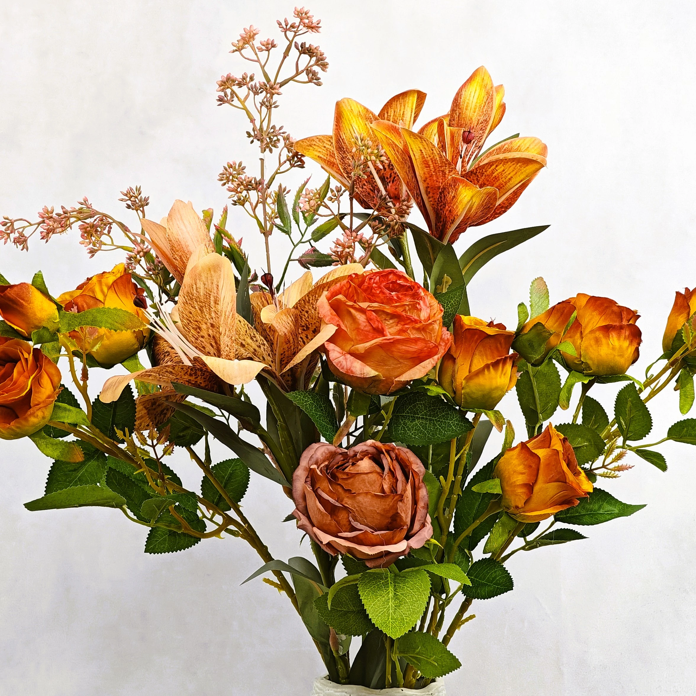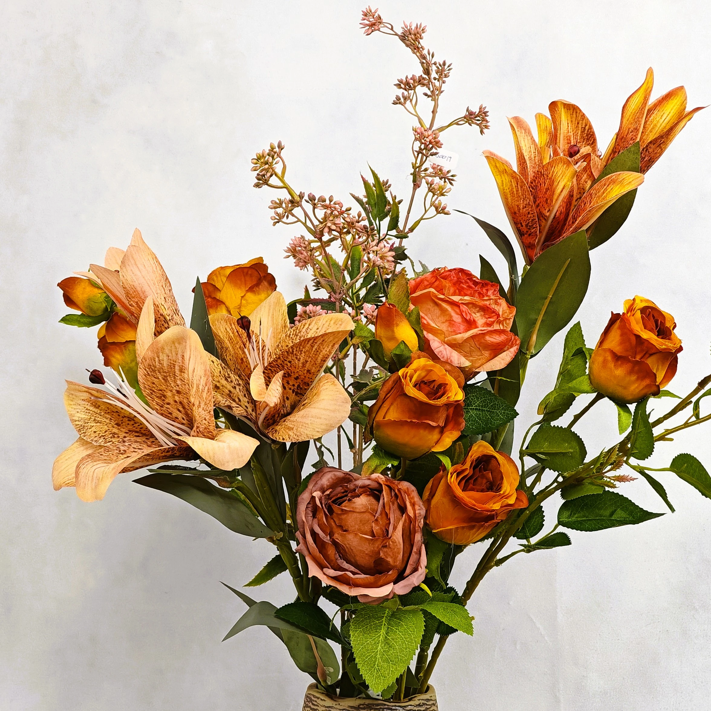 8 tiges – 5 roses, 2 lys, 1 osier – Nuances caramel/orange – Style contemporain – Vase inclu, coloris au choix – Hauteur 70 cm – Diamètre 50 cm
