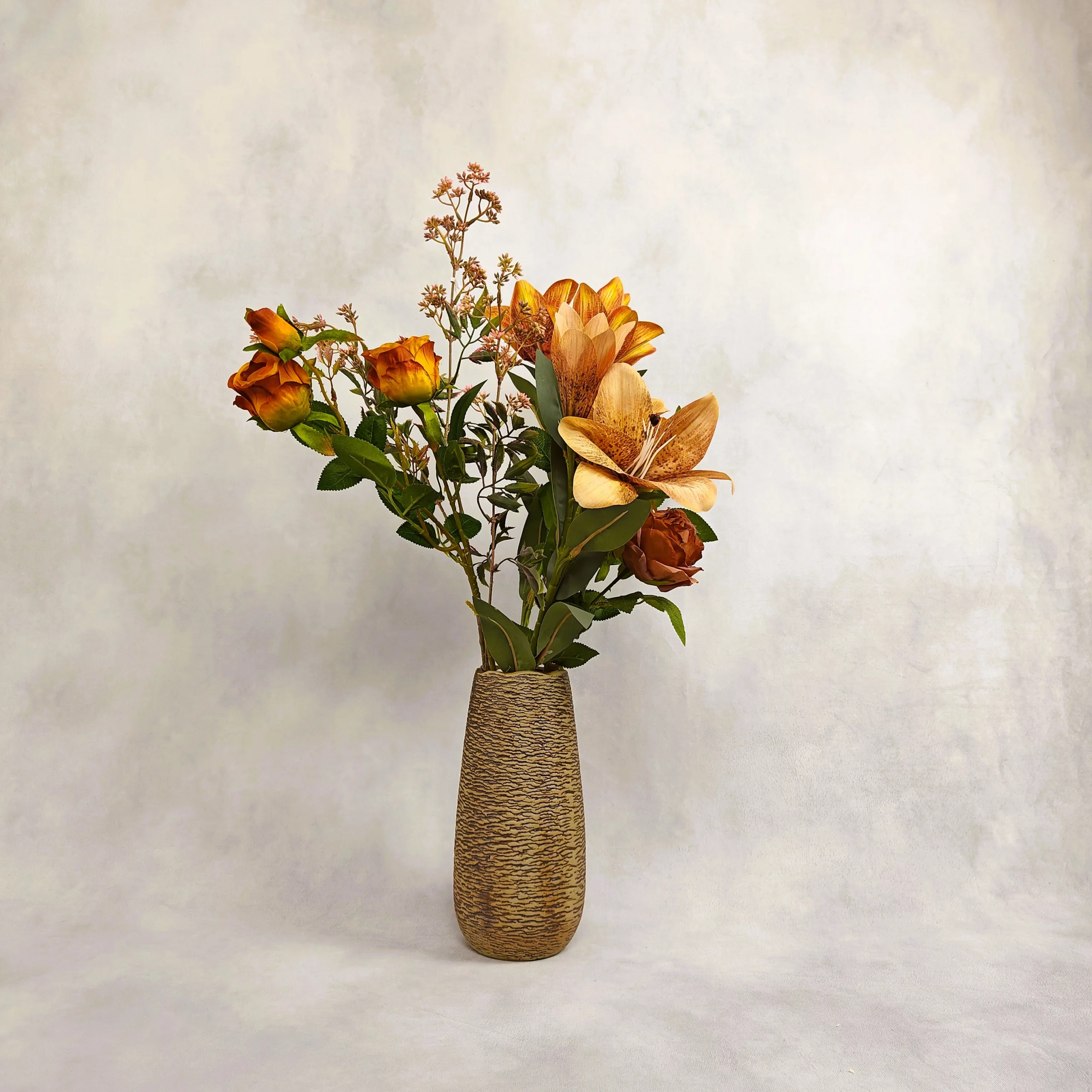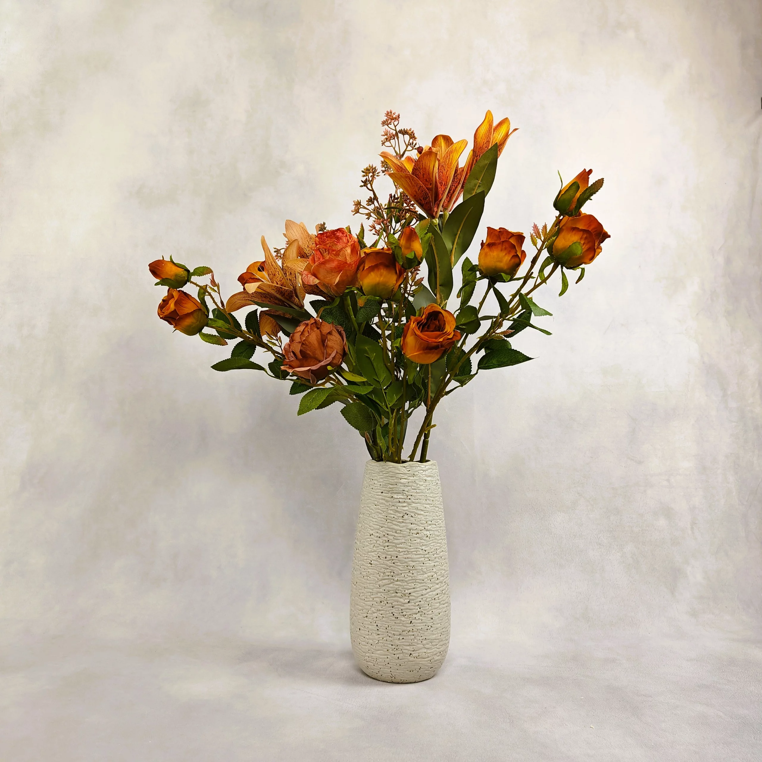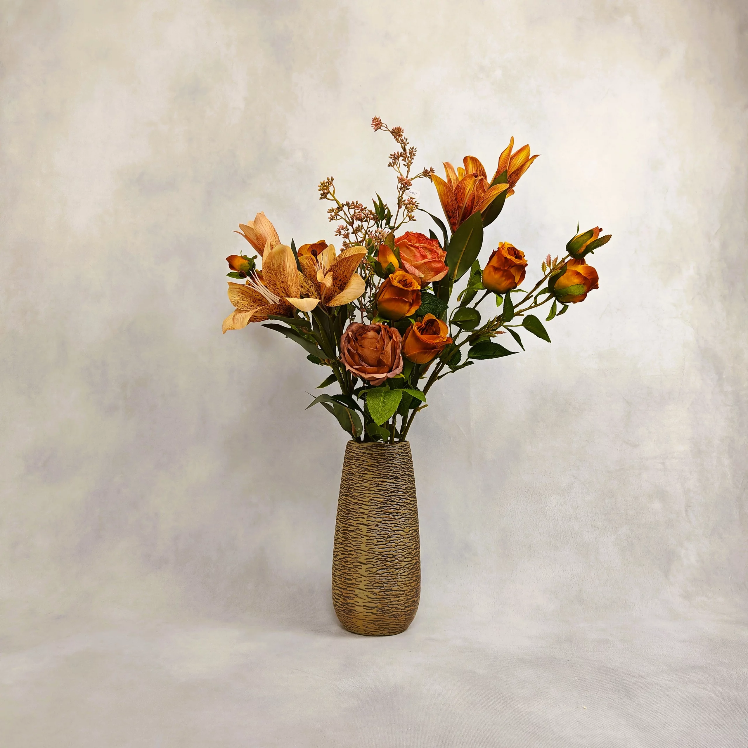 8 tiges – 5 roses, 2 lys, 1 osier – Nuances caramel/orange – Style contemporain – Vase inclu, coloris au choix – Hauteur 70 cm – Diamètre 50 cm