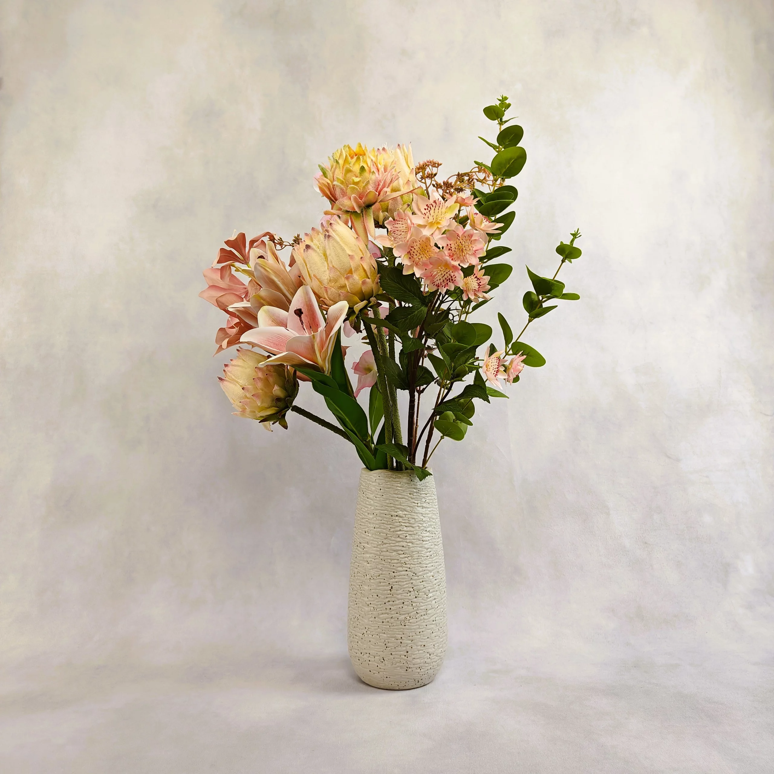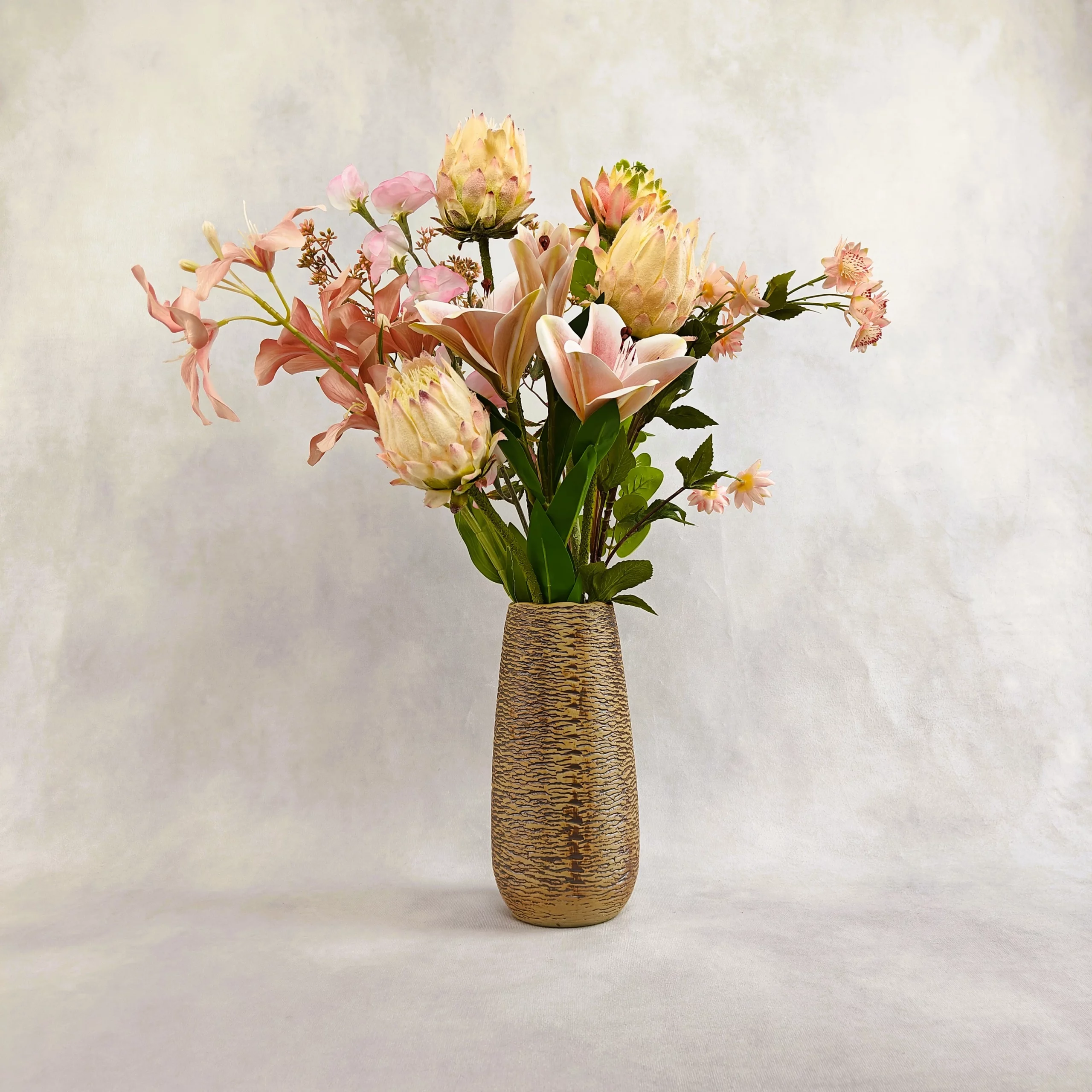 10 tiges – 4 protées royales, 2 orchidée, 1 lys, 1 osier, 1 fleur de pois, 1 feuille d’eucalyptus – Fleurs royales – Éclat nacré – Vase inclu, coloris au choix – Hauteur 70 cm – Diamètre 50 cm