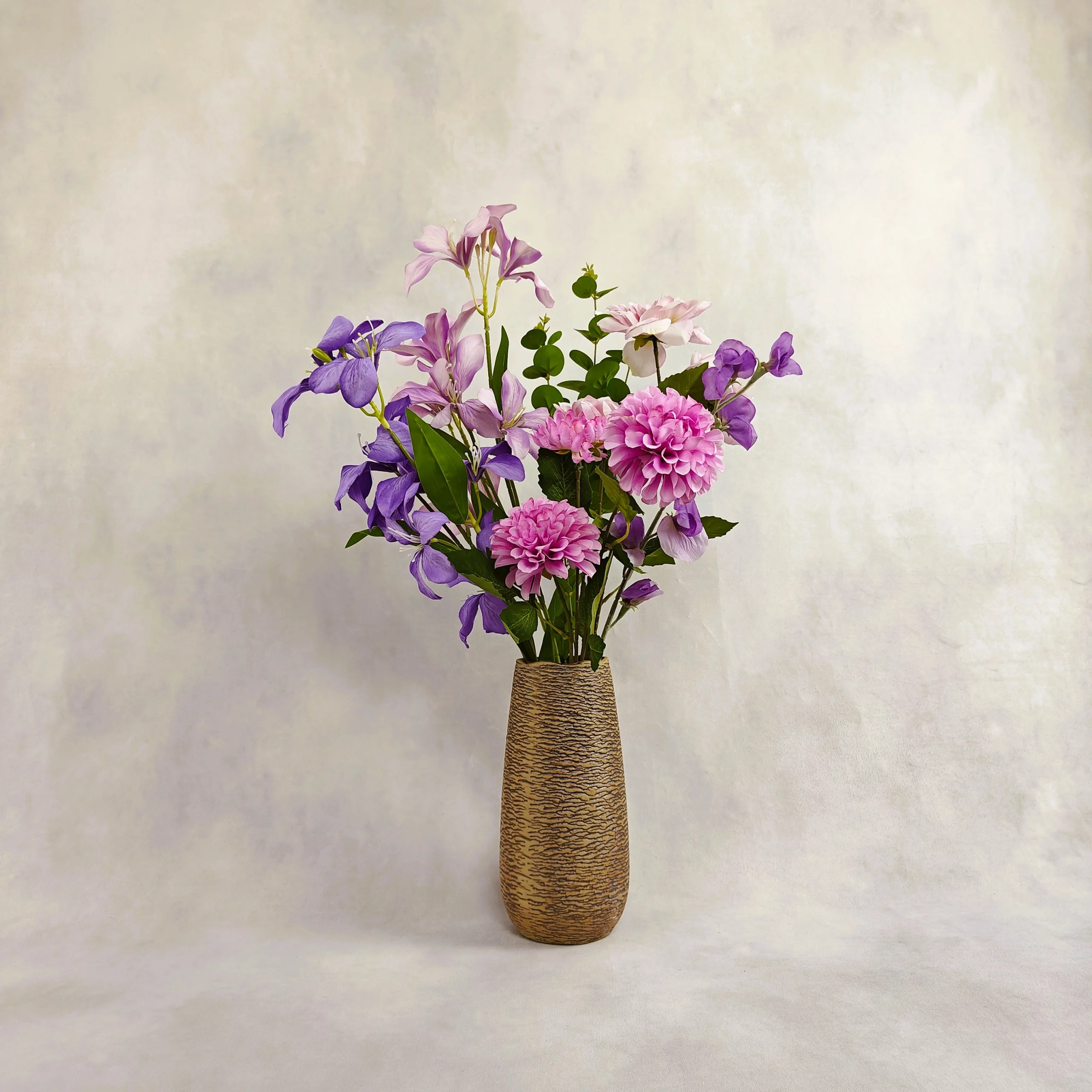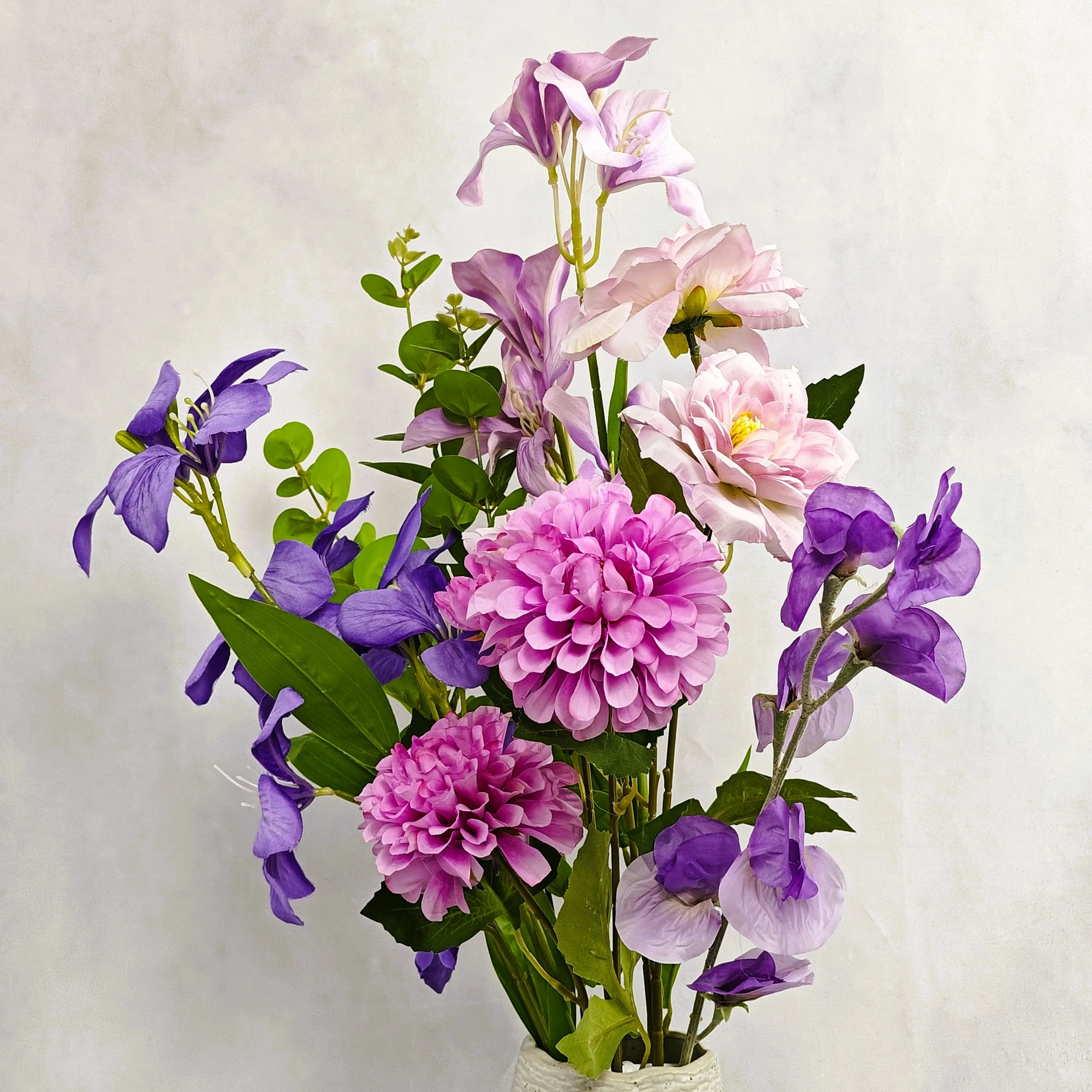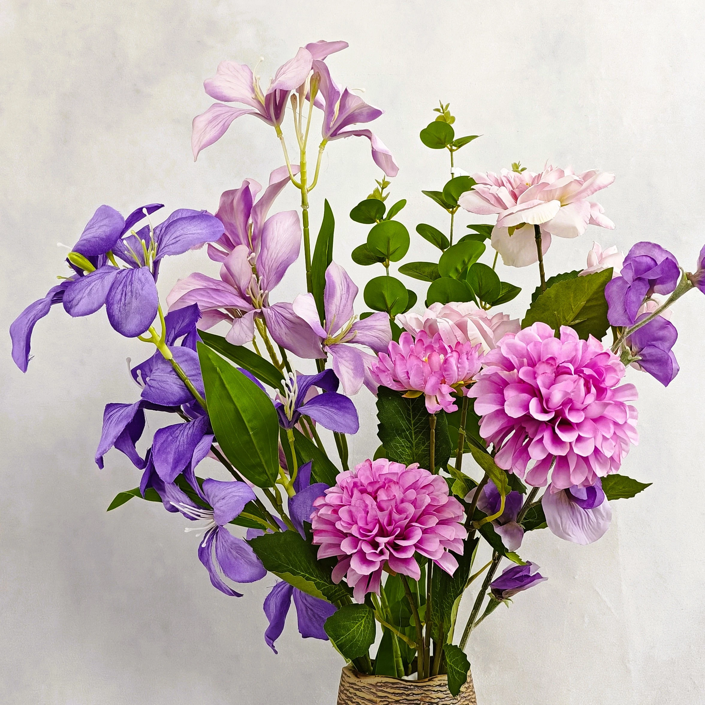 6 tiges – 1 dahlia, 1 rose, 2 orchidées, 1 fleur de pois, 1 feuille d’eucalyptus – Texture soyeuse – Vase inclu, coloris au choix – Hauteur 65 cm – Diamètre 40 cm