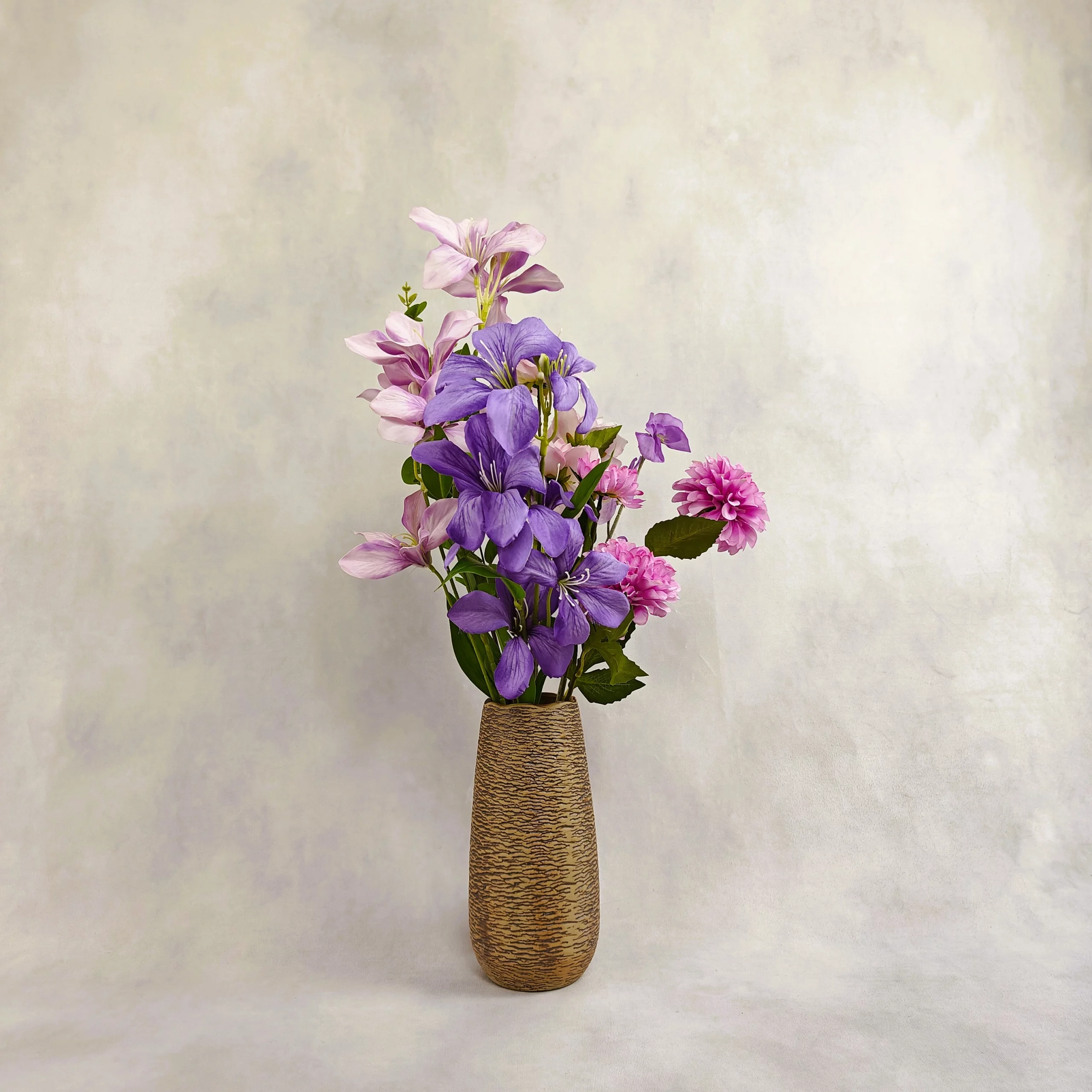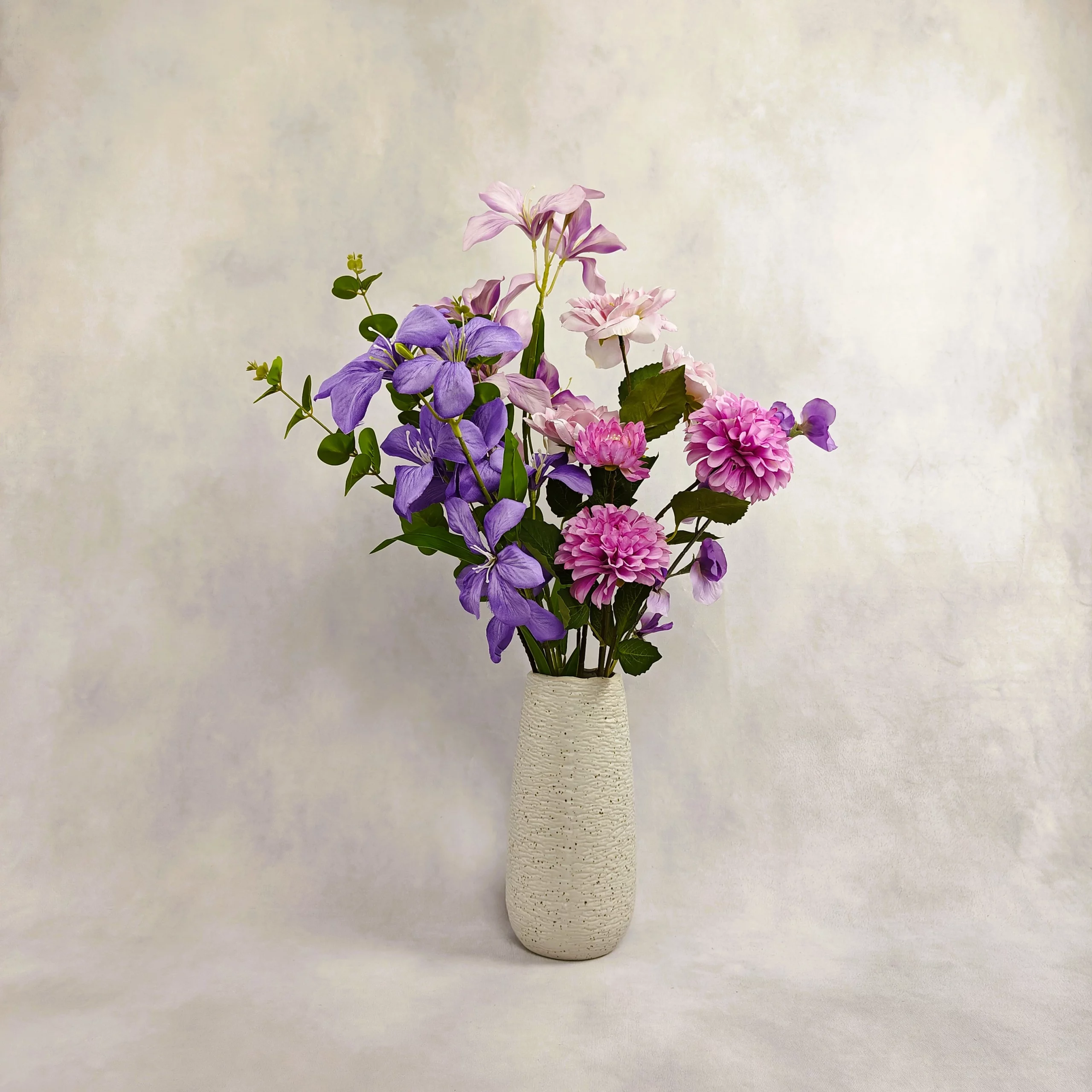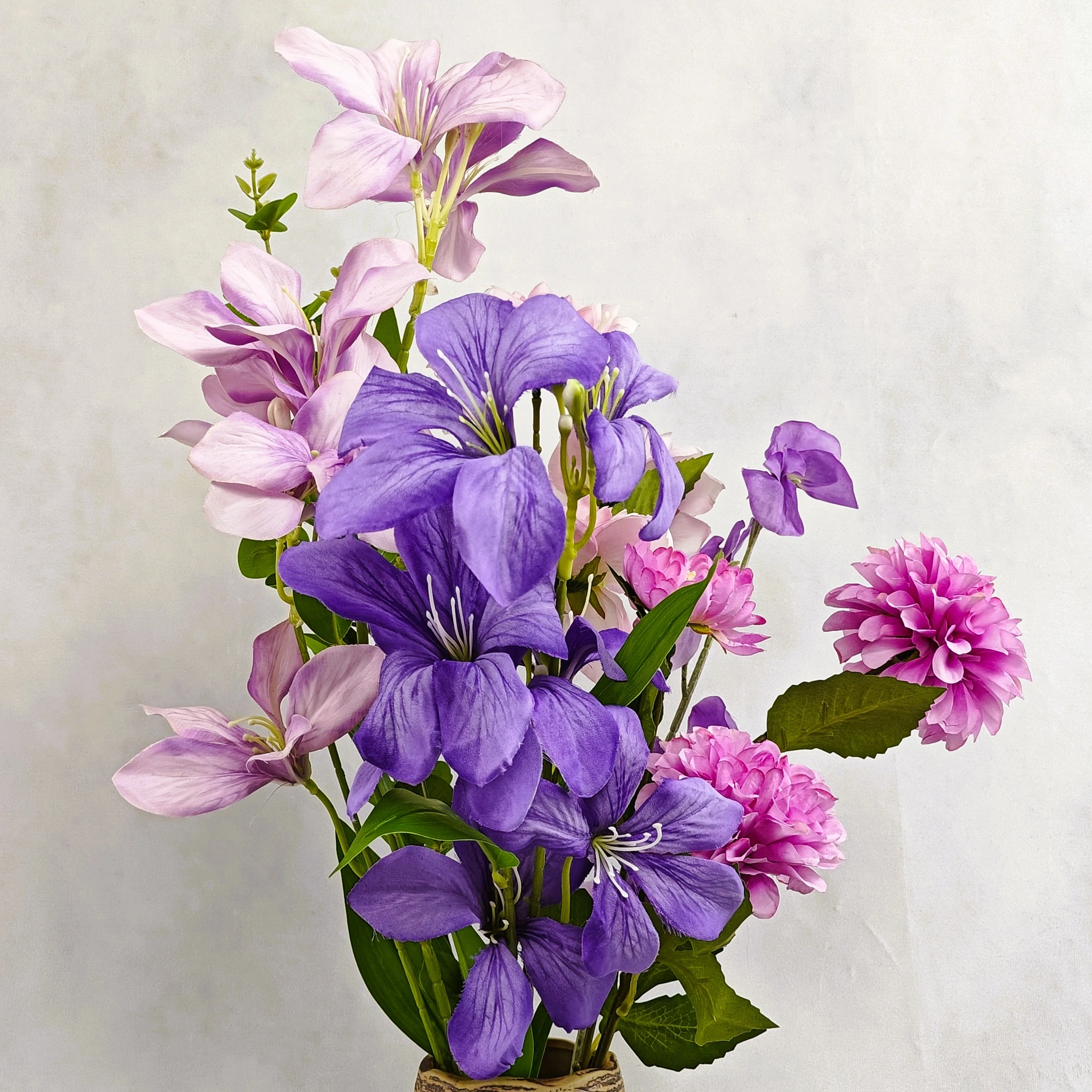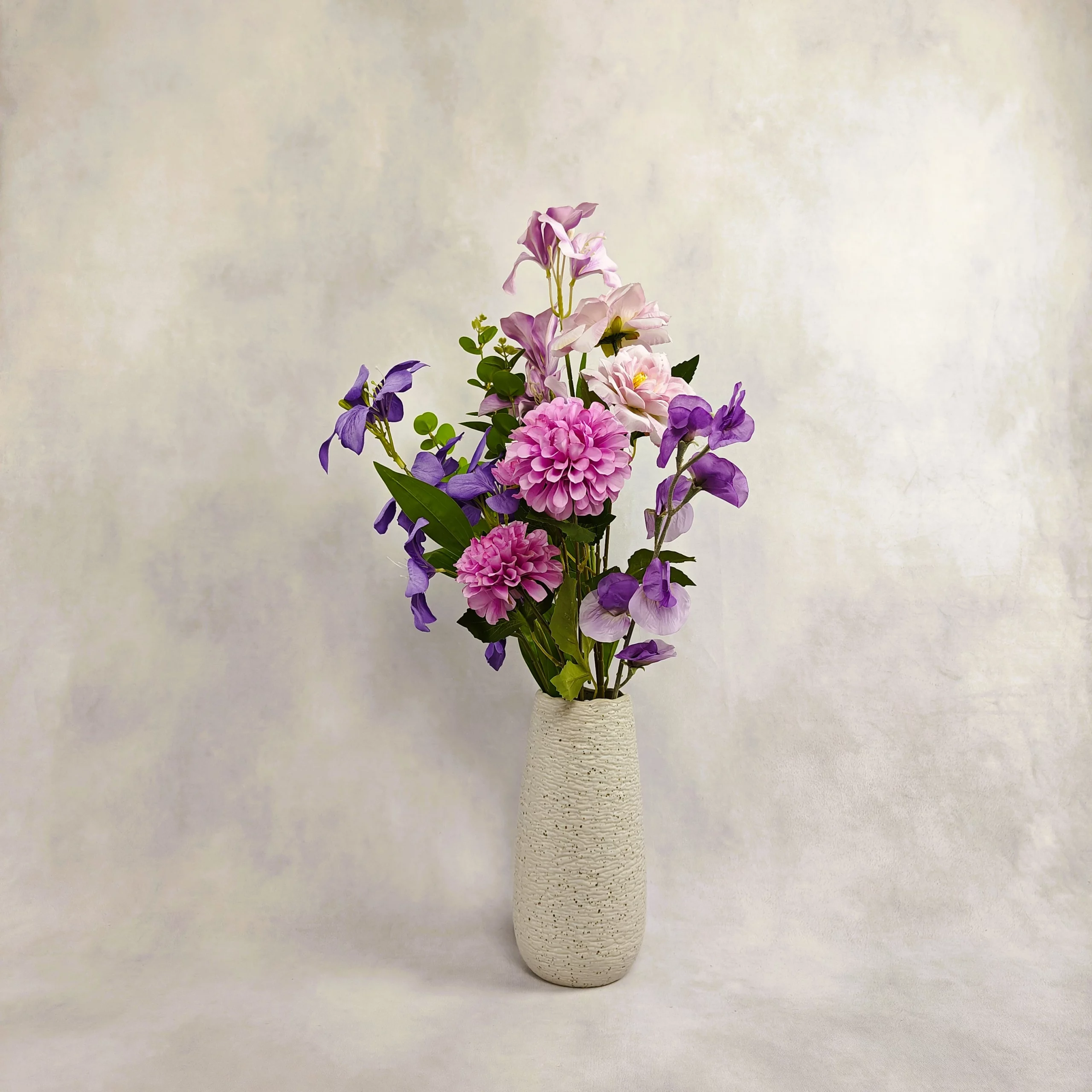 6 tiges – 1 dahlia, 1 rose, 2 orchidées, 1 fleur de pois, 1 feuille d’eucalyptus – Texture soyeuse – Vase inclu, coloris au choix – Hauteur 65 cm – Diamètre 40 cm