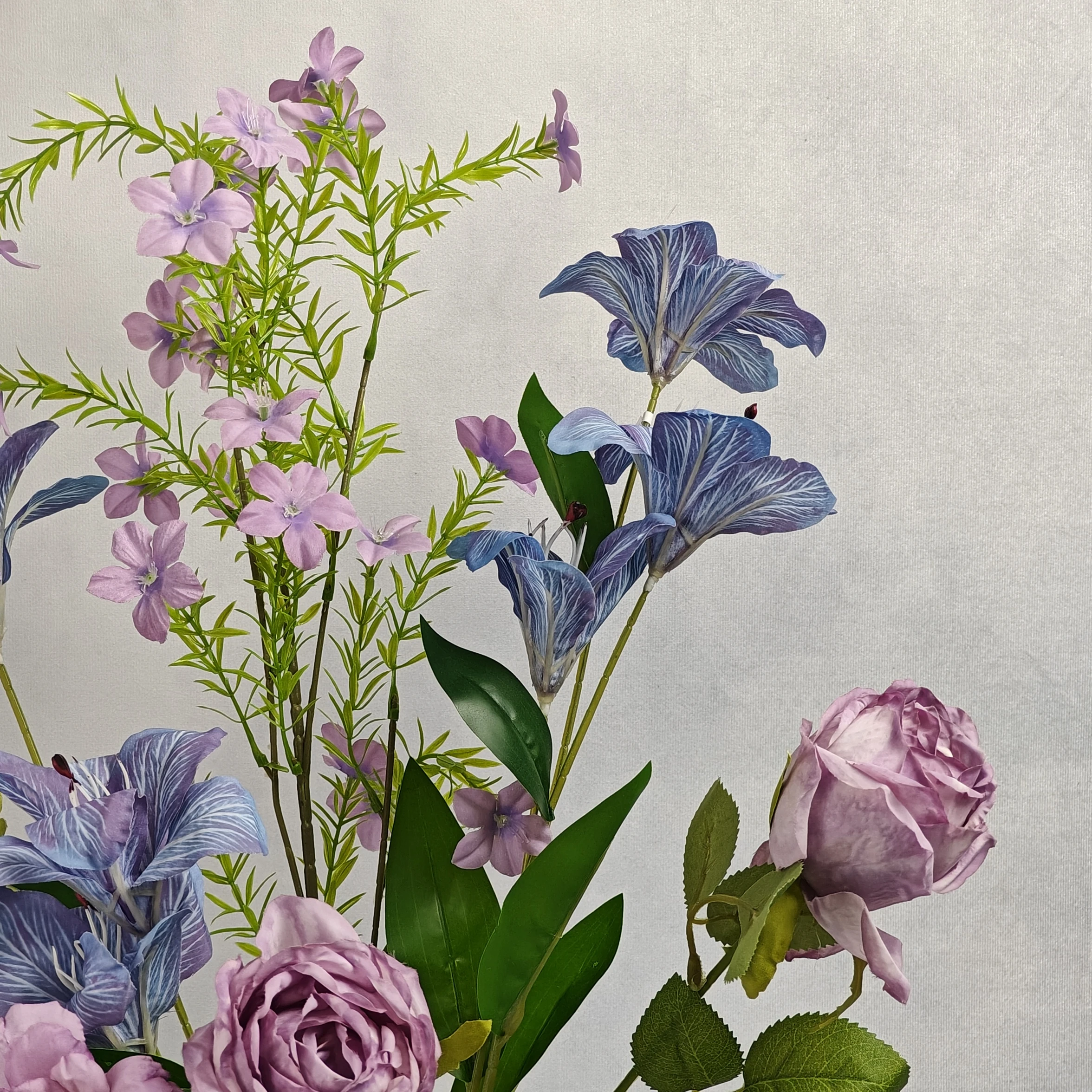 6 tiges – 2 roses, 2 lys, 1 pivoine, 1 legousia – Tons mauve-gris – Vase inclu, coloris au choix – Hauteur 70 cm – largeur 50 cm