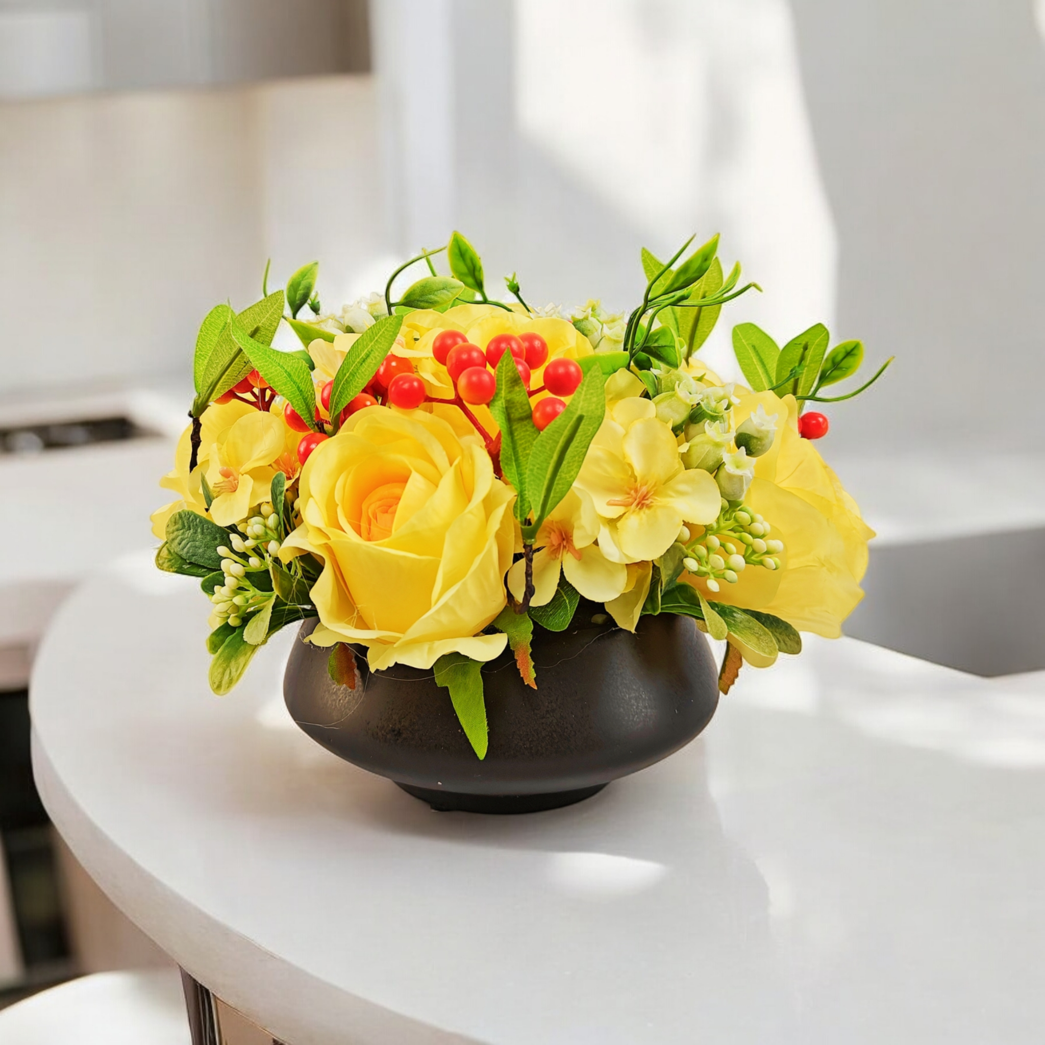 Centre de table moderne – Roses et baies de couleurs variées