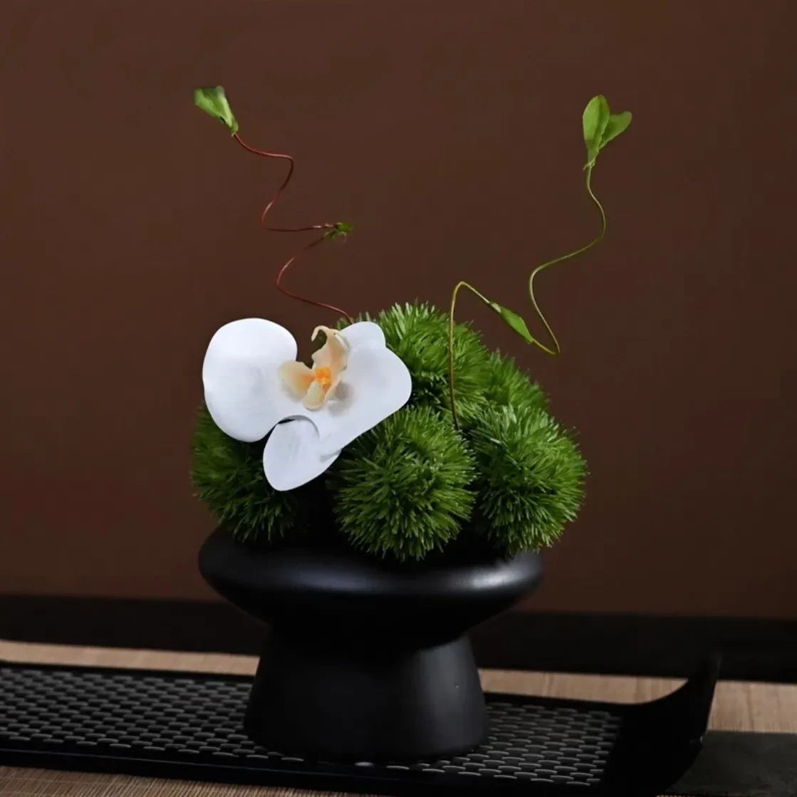 Vase au choix – Orchidée blanche et pissenlits verts – Mouvement printanier – Hauteur 25 cm – Largeur 20 cm