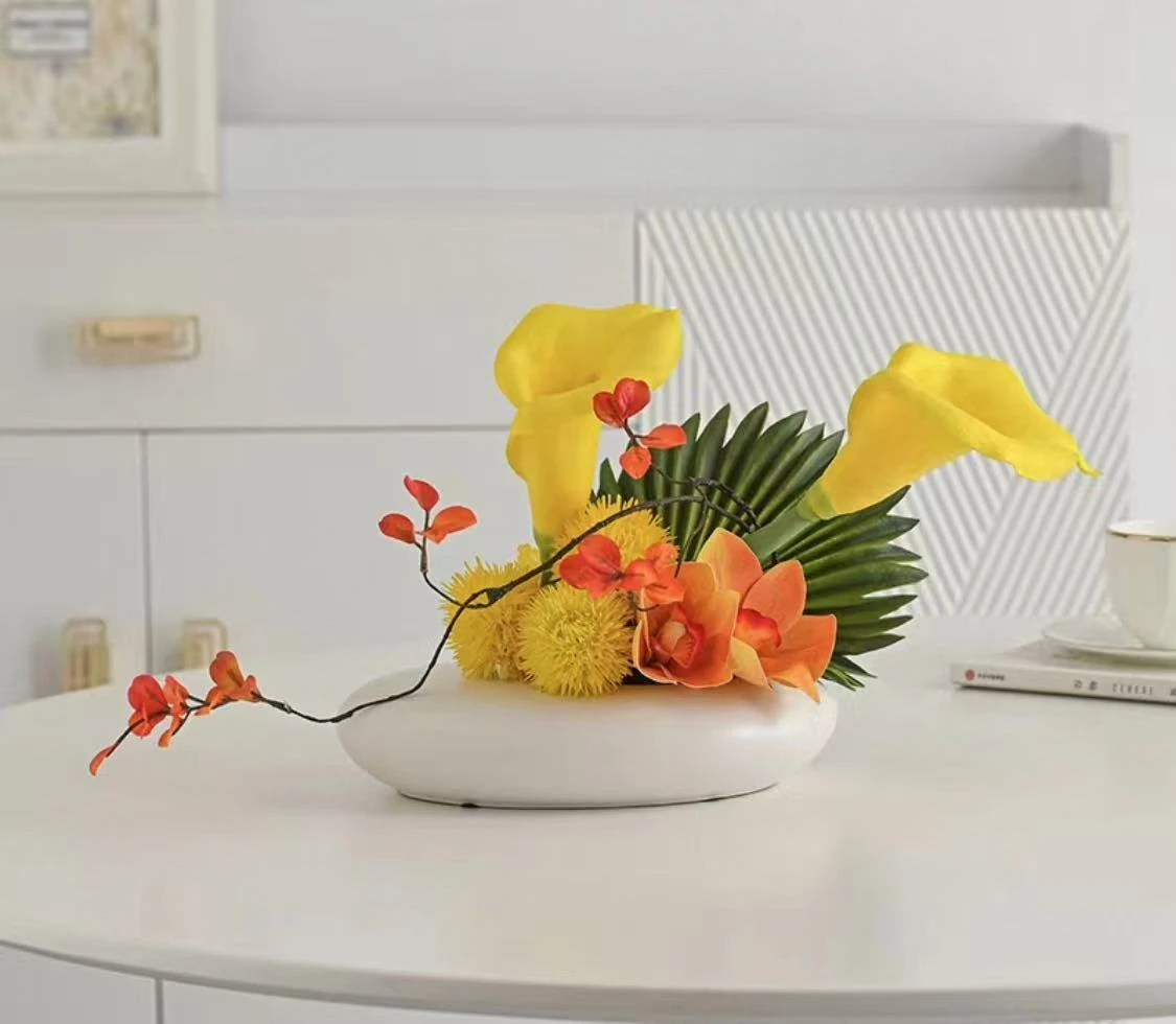 Plat blanc – Magnolias oranges, lys jaunes et pissenlits – Style moderne – Hauteur 25 cm – Largeur 30 cm
