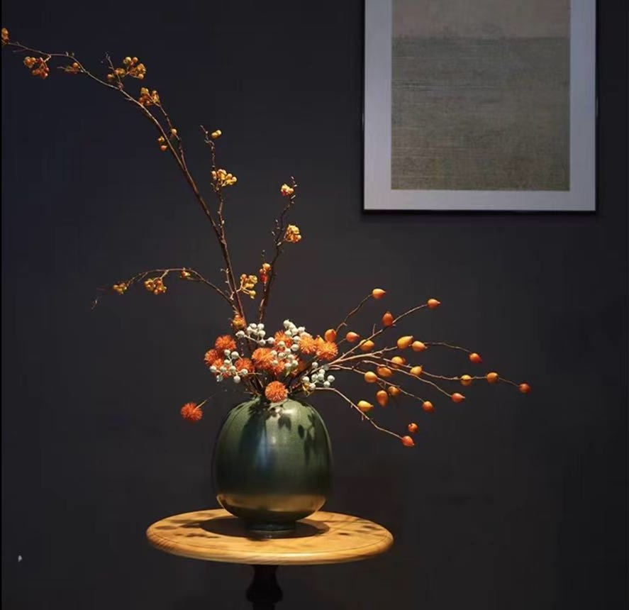 Porcelaine émaillée bleue paon – Arangement de fleurs et baies orangées – Largeur 90 cm – Hauteur 85 cm