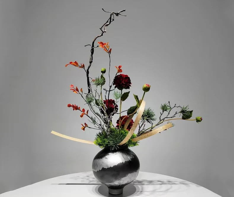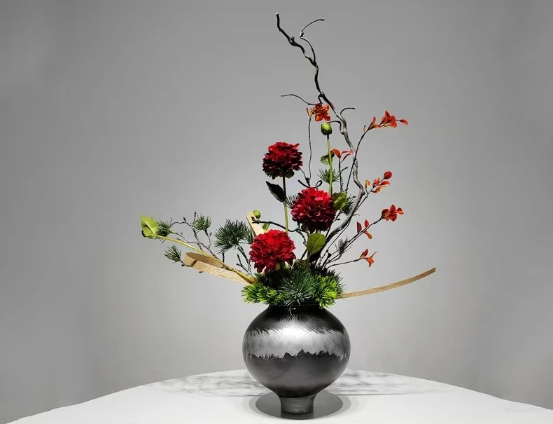 Porcelaine couleur suie à motif – Composition de dhalias rouge et branches faite à la main – Largeur 55 cm – Hauteur 78 cm