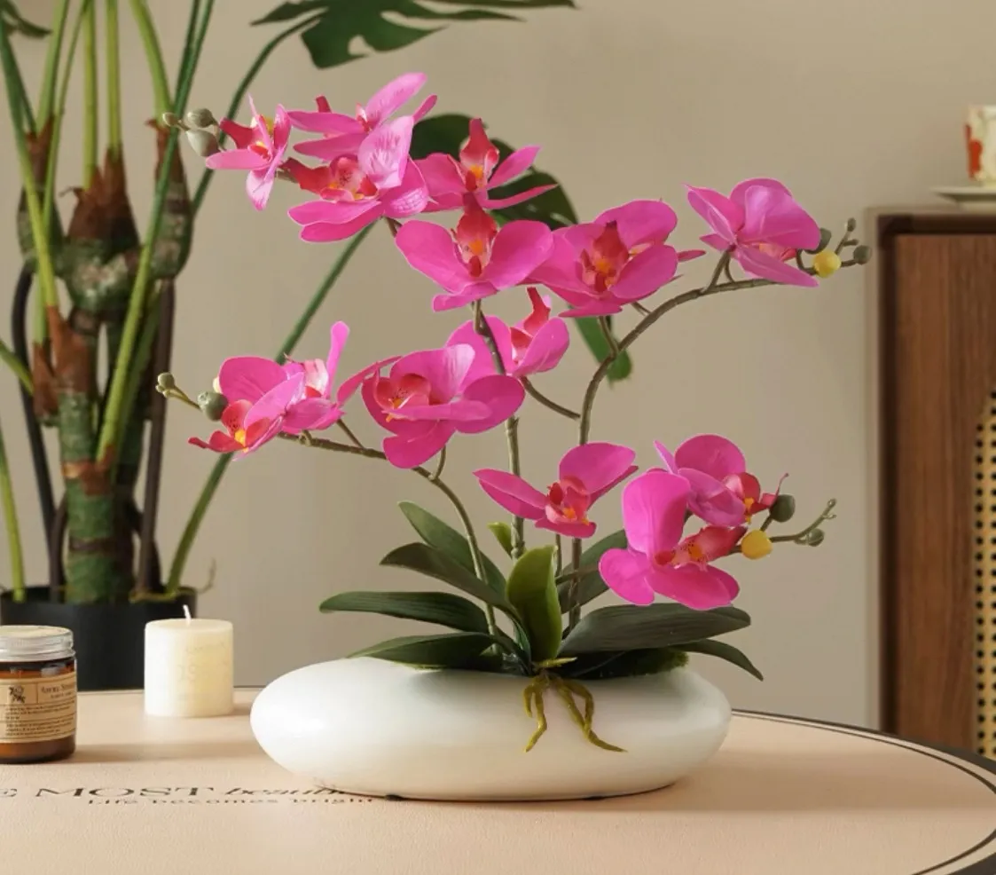 2 tiges d’orchidées – Couleur au choix – Base céramique blanche – Hauteur 40 cm – Largeur 35 cm