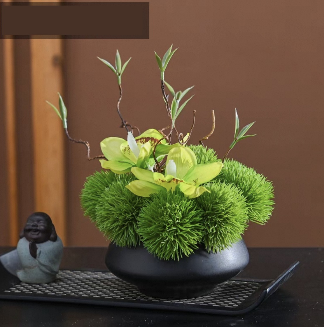 Pot noir – Arrangement d’orchidées et dahlias vertes, baies blanches – Hauteur 27 cm – Largeur 20 cm