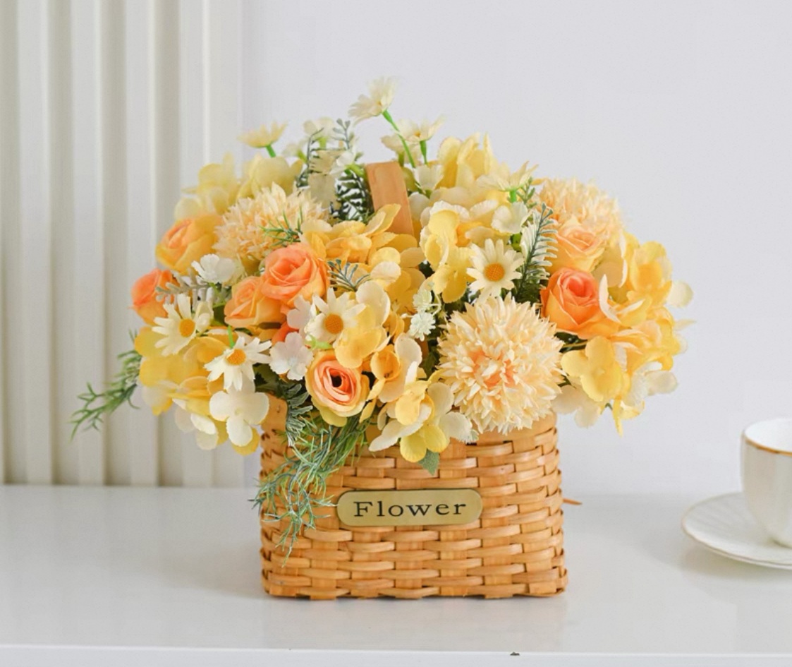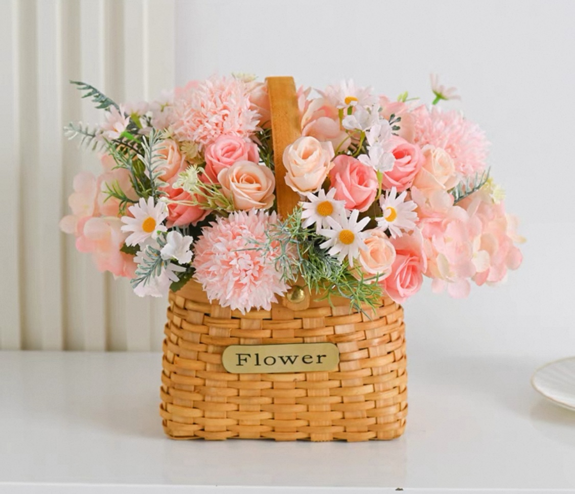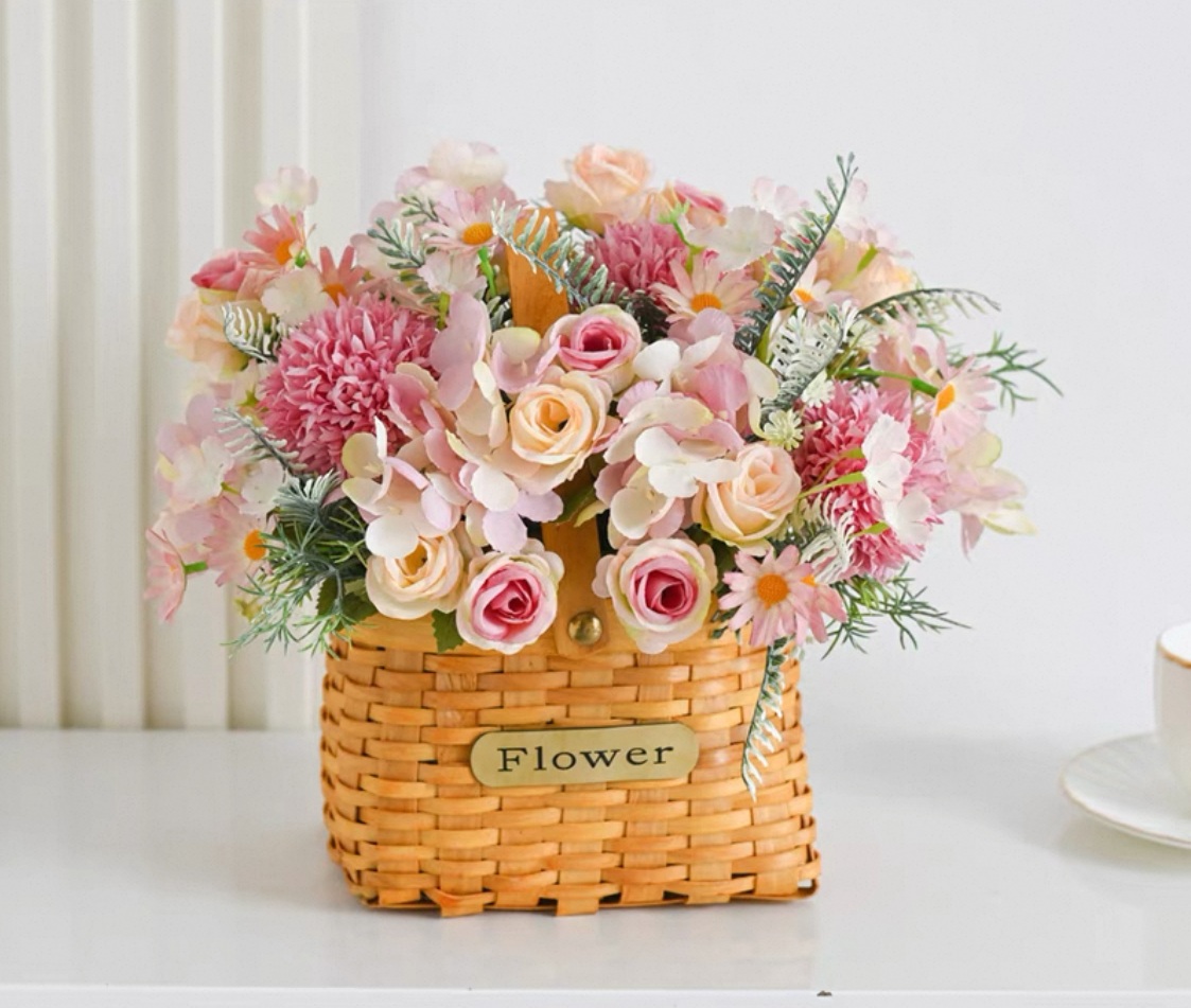 Panier tressé rectangulaire – Bouquets de roses, dhalias et marguerites – Tons variés – Hauteur 30 cm – Largeur 20 cm