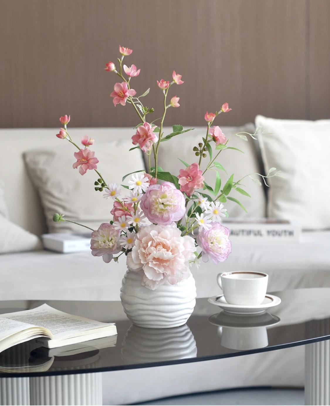 Porcelaine blanche – Pivoines et fleurs de prairie – Variations roses – Ambiance matinale – Hauteur 40 cm – Largeur 15 cm