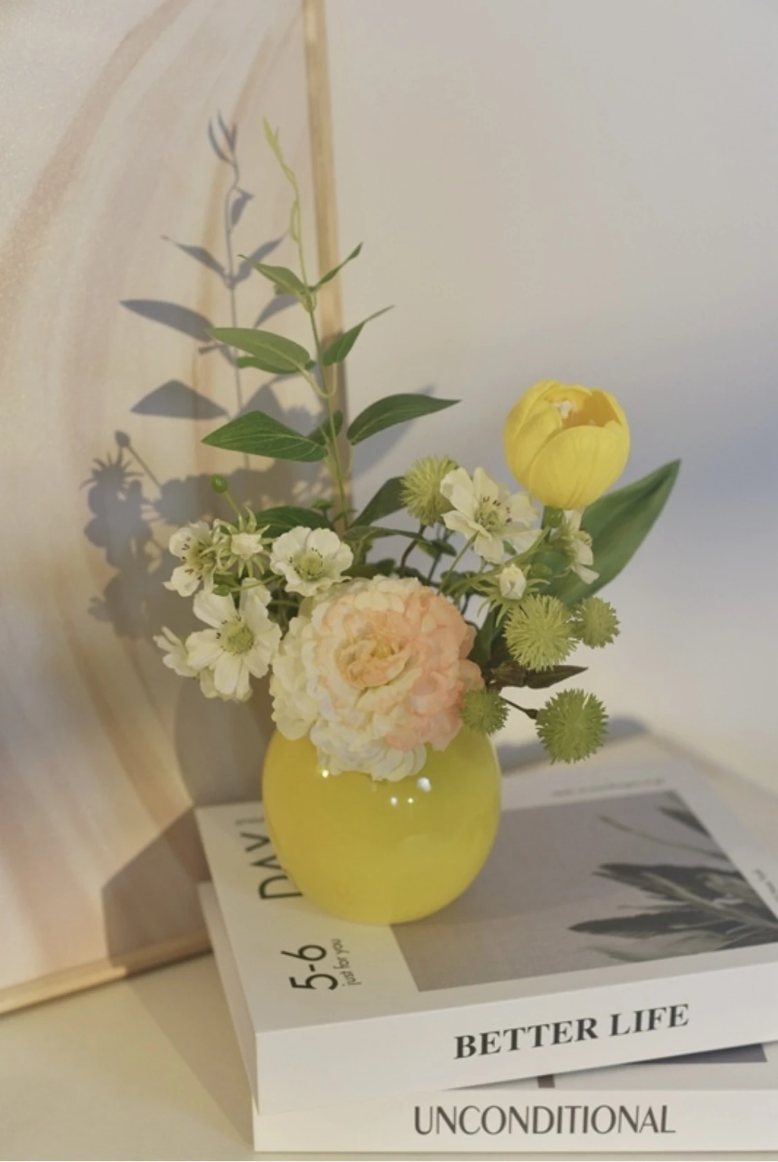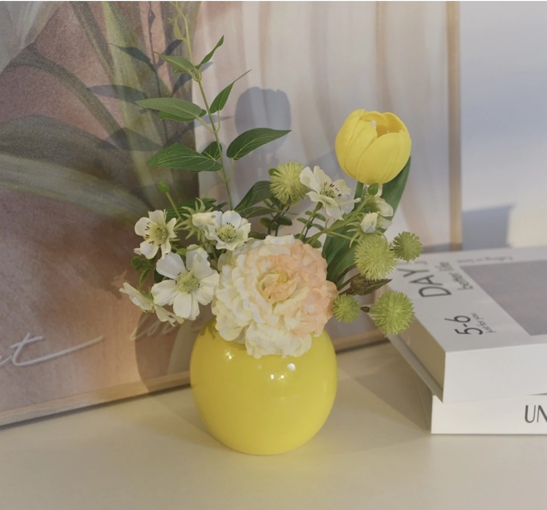 Porcelaine jaune – Tulipe et fleurs de prairie – Variations jaune, orangée et blanche – Ambiance printanière – Hauteur 30 cm – Largeur 15 cm