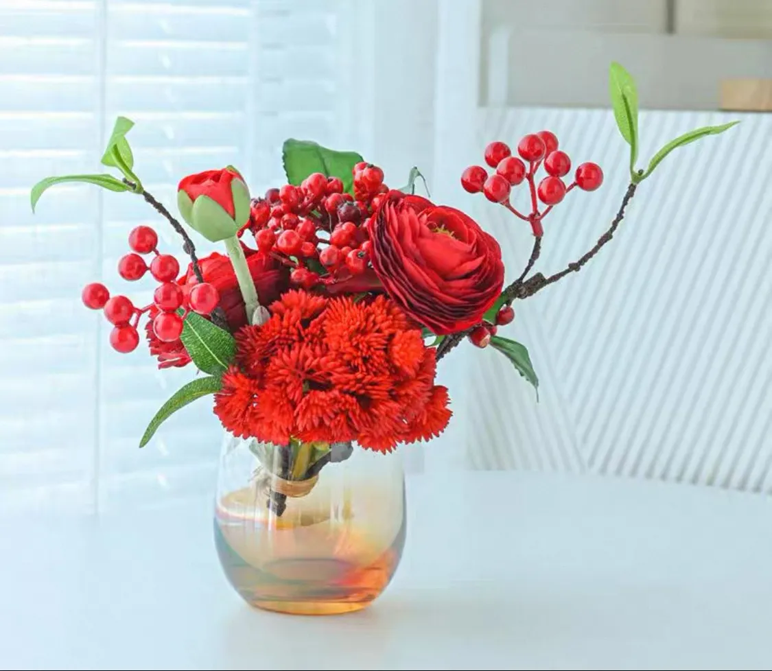 Vase au choix – Pivoine et baies rouges – Variations rouges – Ambiance nocturne – Hauteur 25 cm – Largeur 20 cm