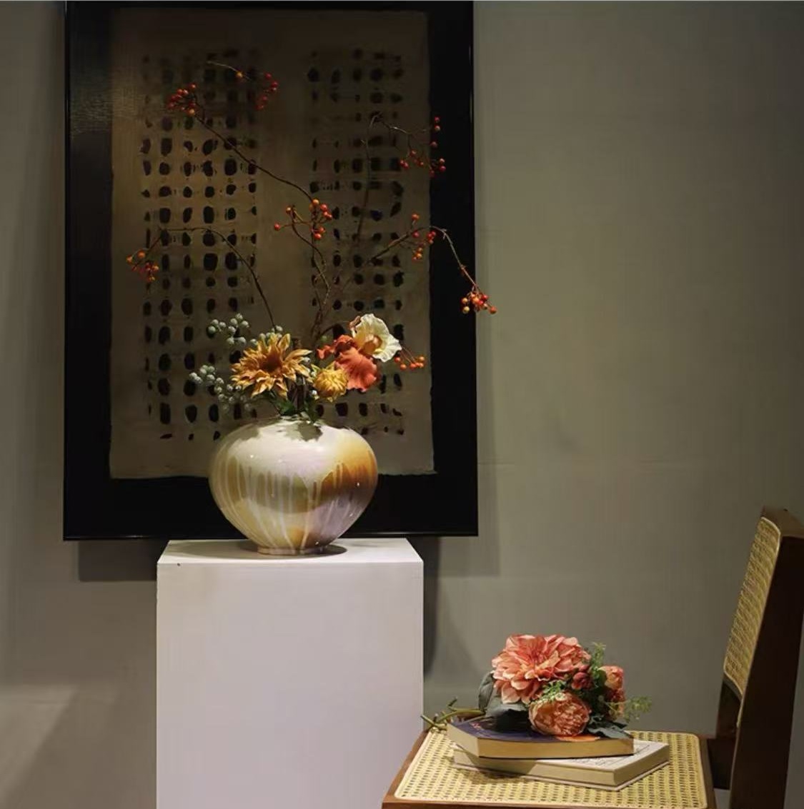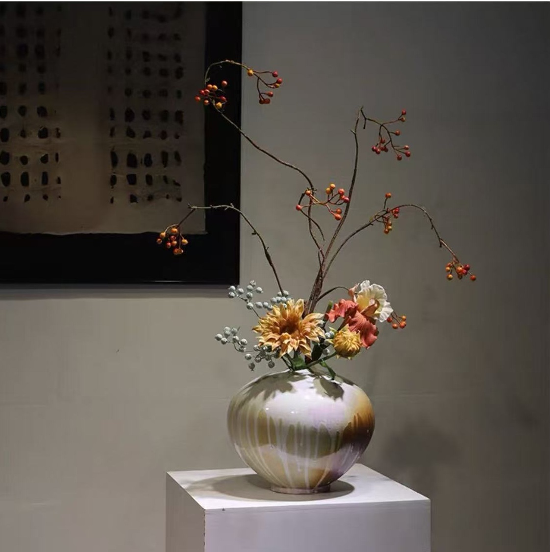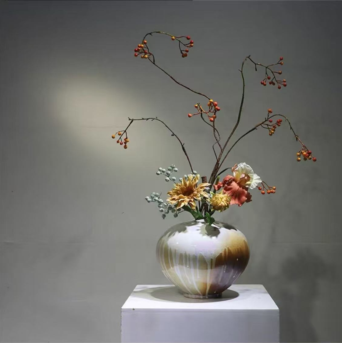 Porcelaine aux coulures glaçurées faites main – Composition florale et baies orangées – Largeur 60 cm – Hauteur 75 cm